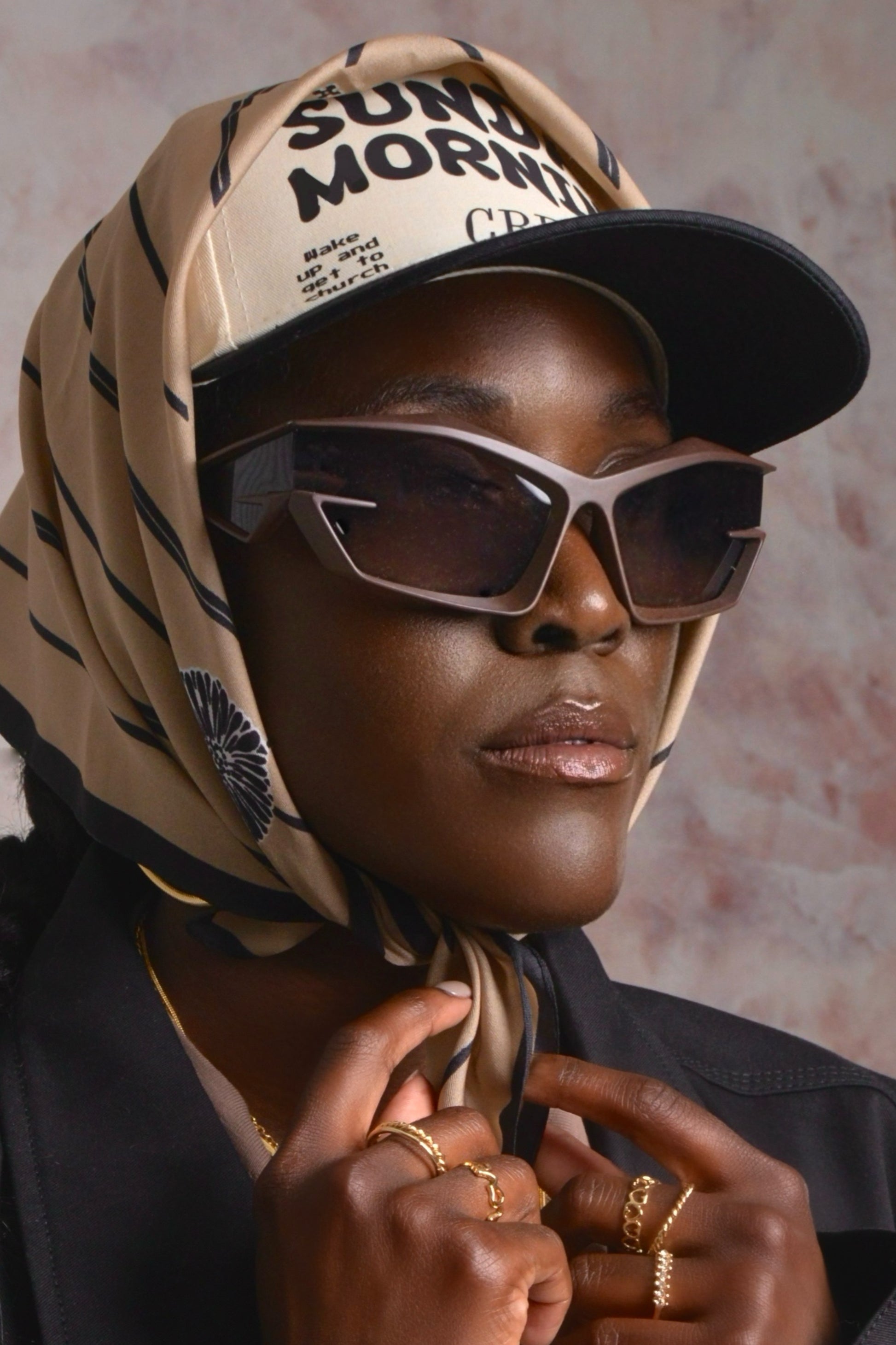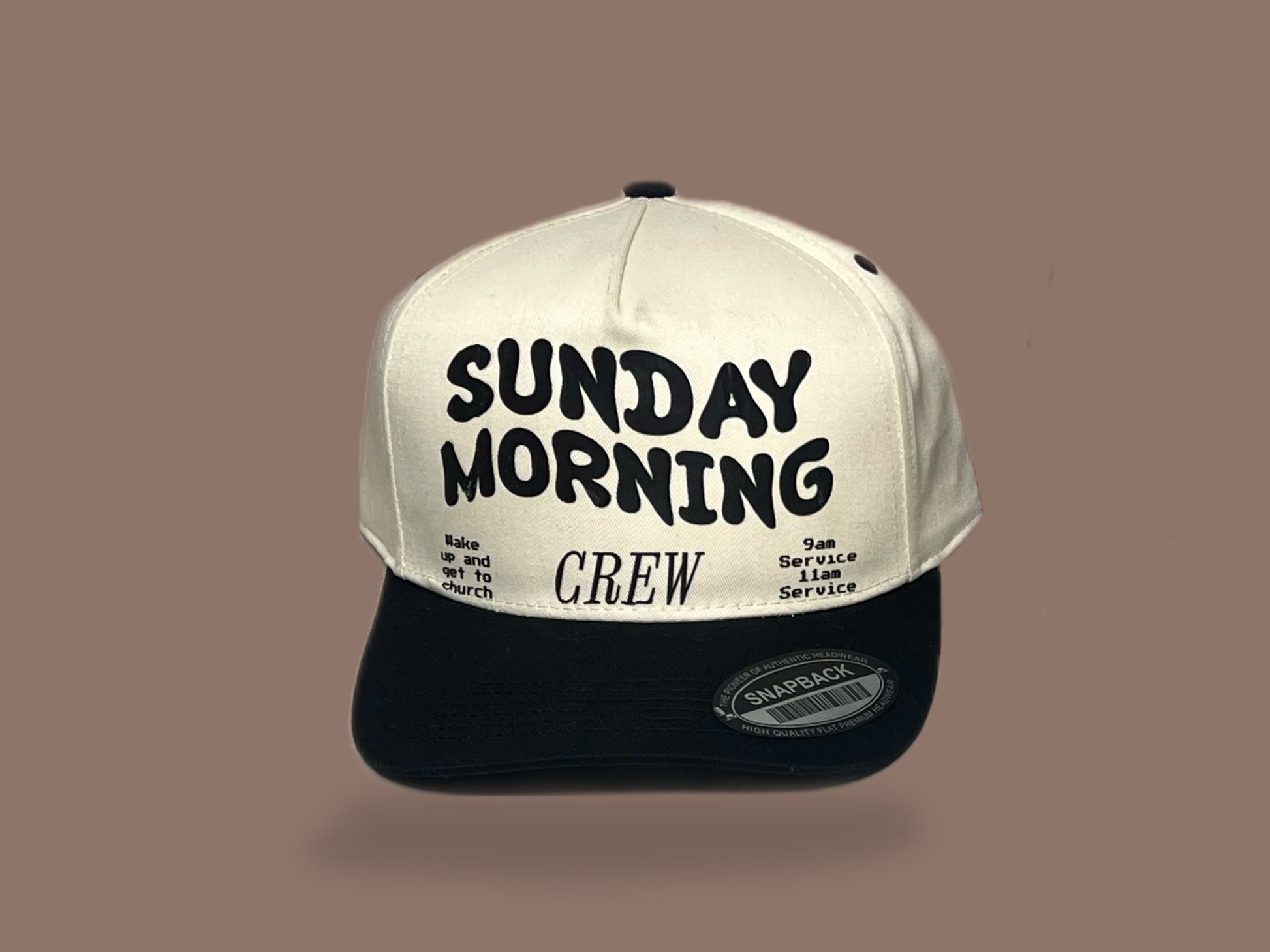 CLASSIC TWO TONED SNAPBACK HAT FEATURES SUNDAY MORNING CREW TEXT ON THE FRONT.
